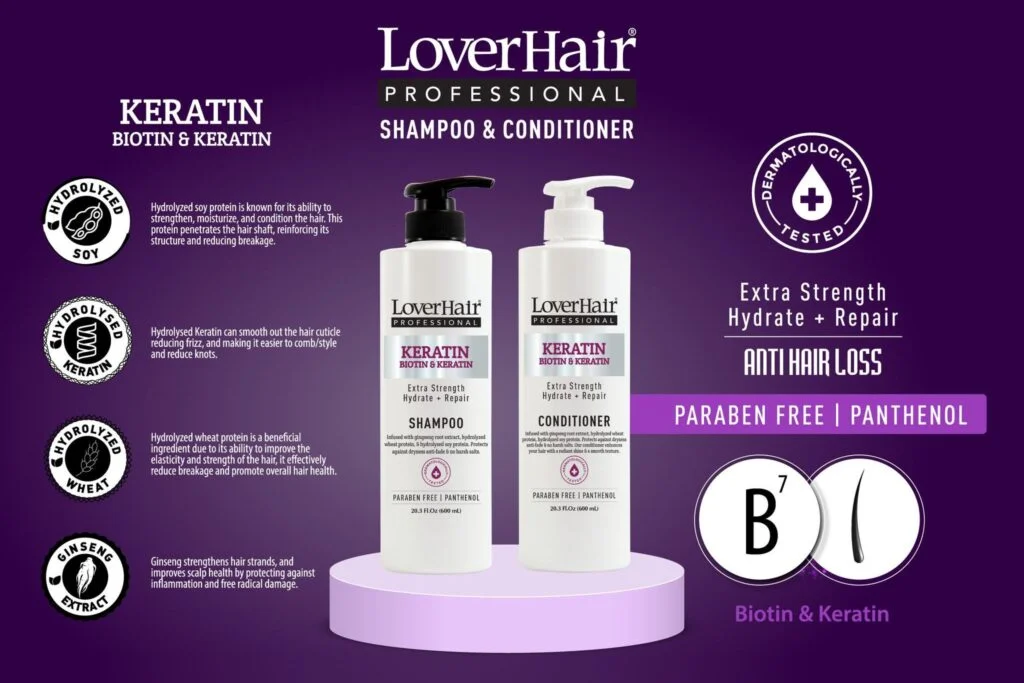 LoverHair Keratin Shampoo strengthens, hydrates, and smooths hair with Biotin, Keratin, and nourishing proteins—paraben-free and gentle for silky, healthy-looking hair.